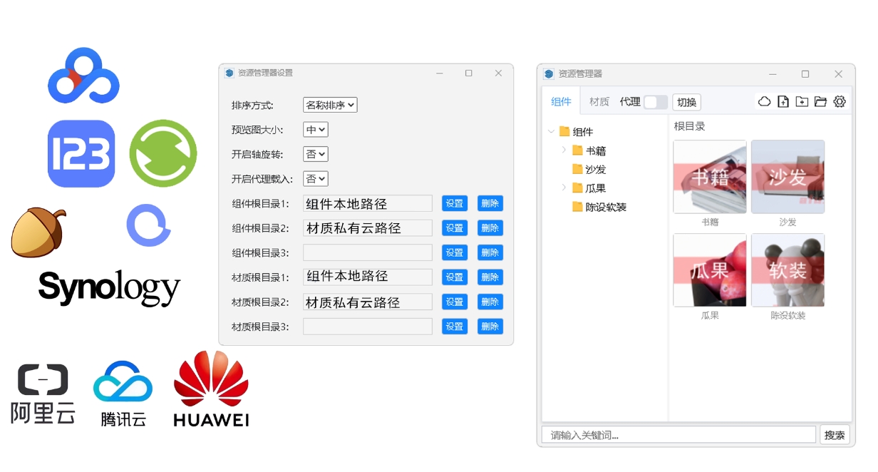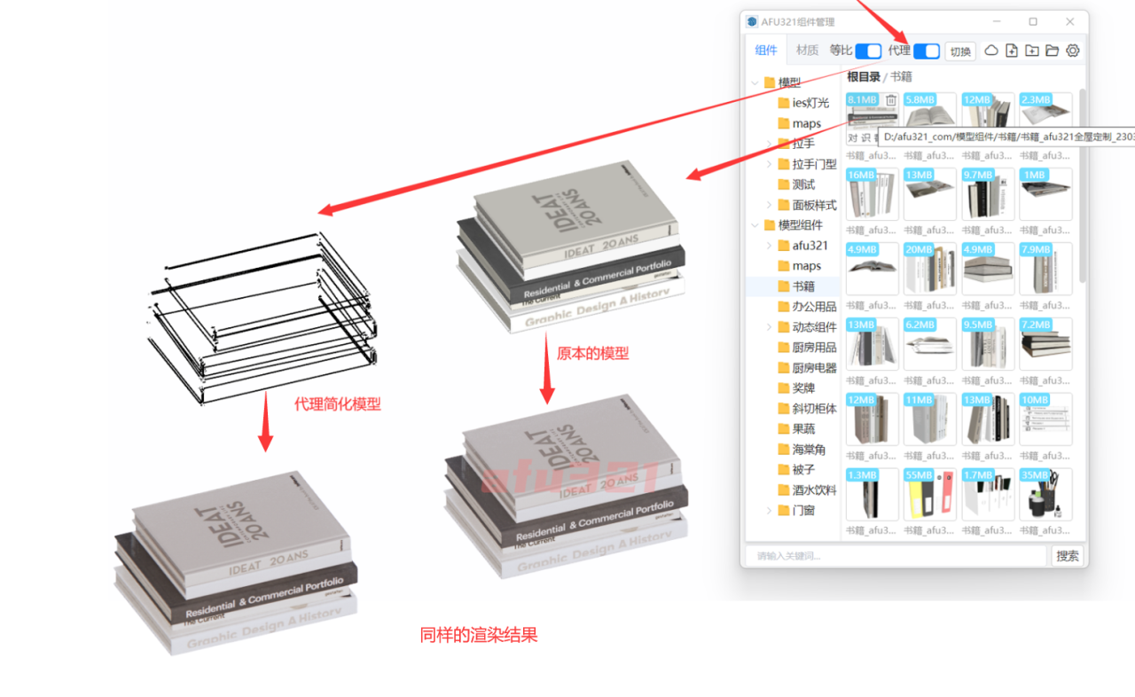 管理通用模型、组件、材质、灯光、模型代理、PBR材质打包解包、材质清理、搜索、入库、缩略图自定义….