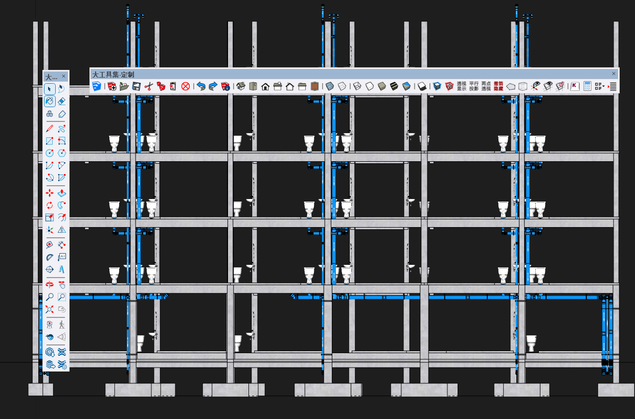 本工具均为SketchUp本身功能命令集合,不占任何资源,不和任何插件进行冲突,常用的SketchUp操作的功能均集合在定制大工具集上,一条工具条可以从打开模型开始即可工作而无需再开启另外多余的工具条使得界面简洁而让工作效率倍增。