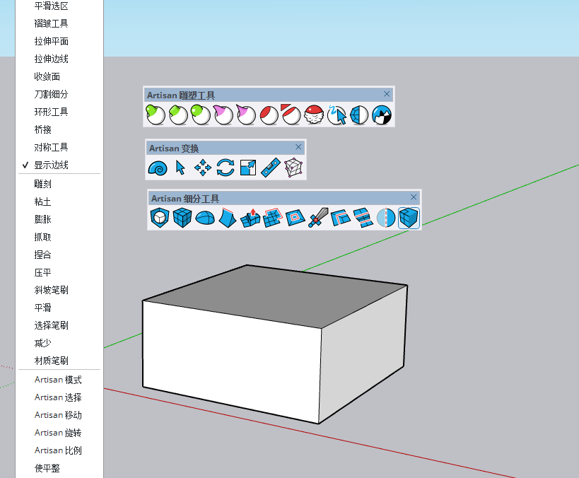 Artisan是SketchUp的一个辅助快速建模插件,拥有对选择的面进行细分和光滑等等一系列强大且实用的功能,凭借强大的细分、雕刻和软选择工具,Artisan非常适合创建:地形地貌、家具、字符、抽象雕塑与装饰物、织物、窗帘和枕头、岩石、树木和植物。
