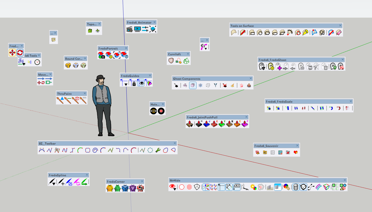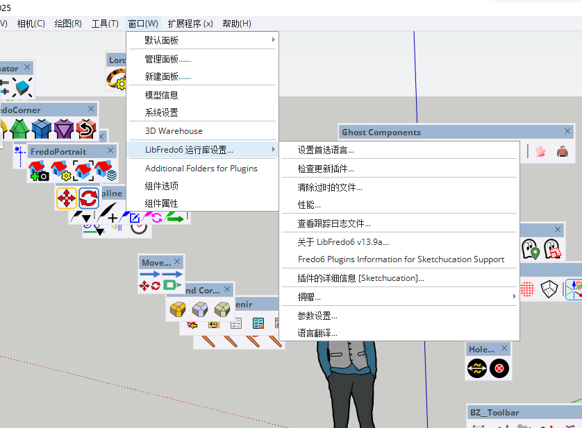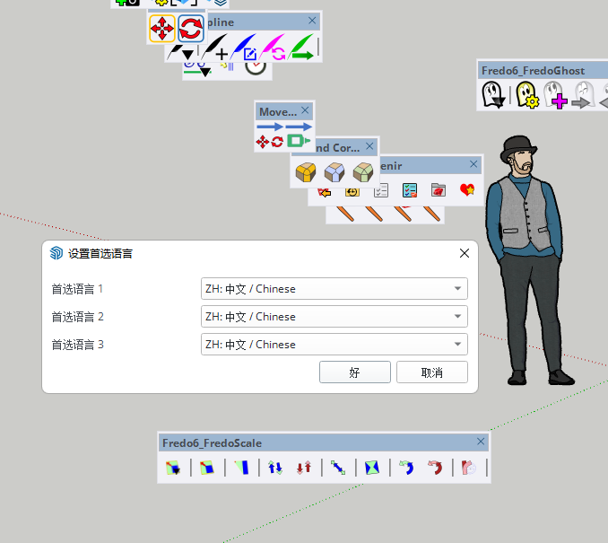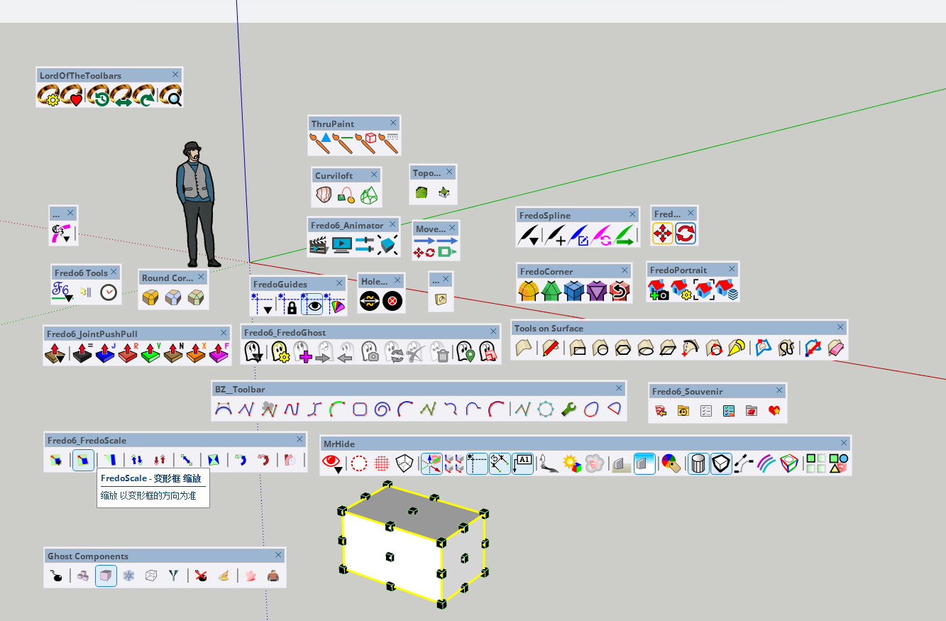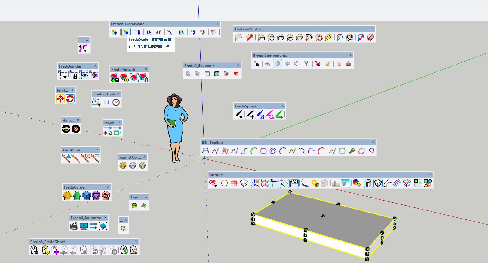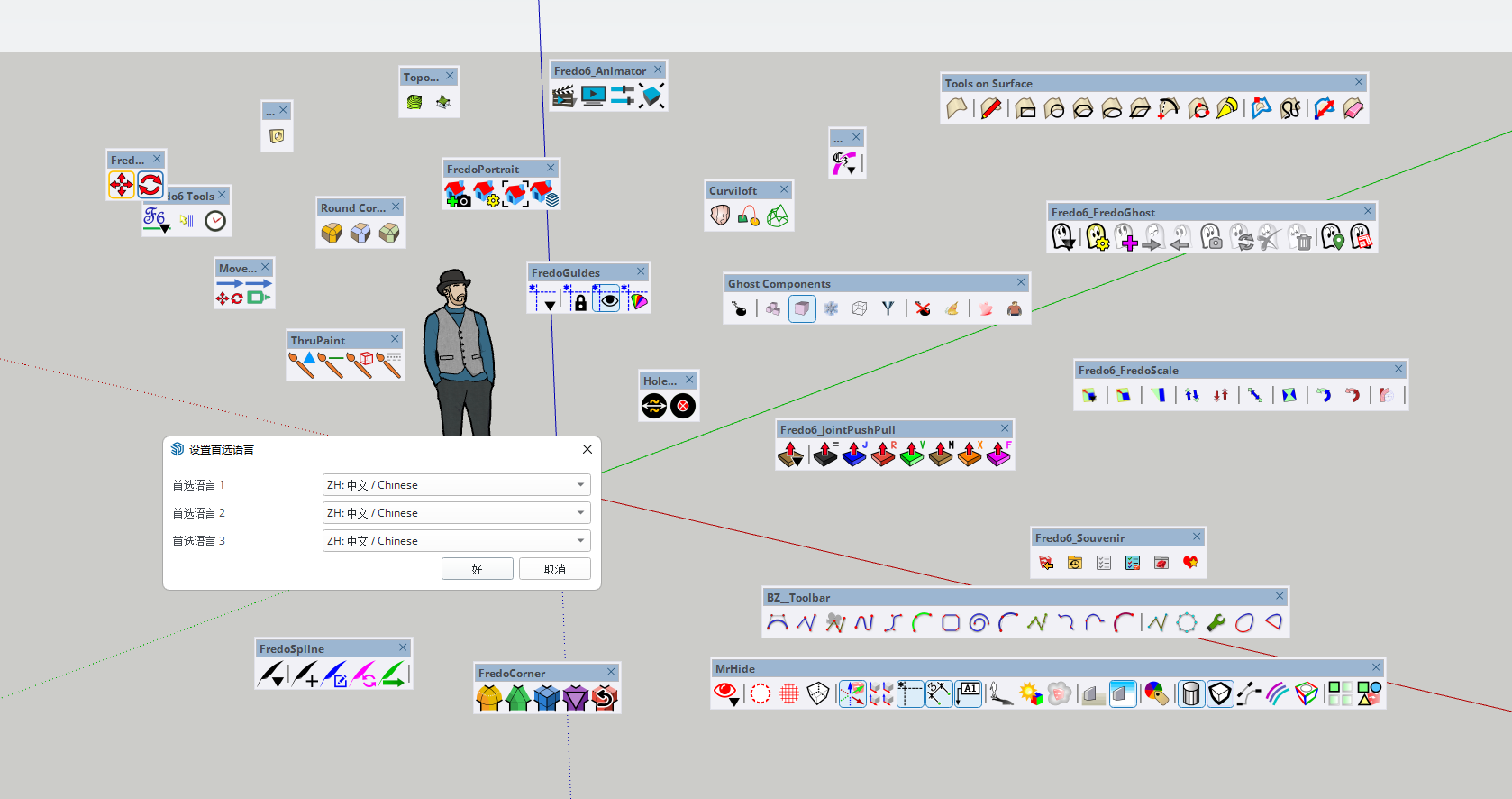OK,是所有的Fredo6工具,全绿色学习版,无需联网及注册,可以选择设定问中文界面或者自助翻译。