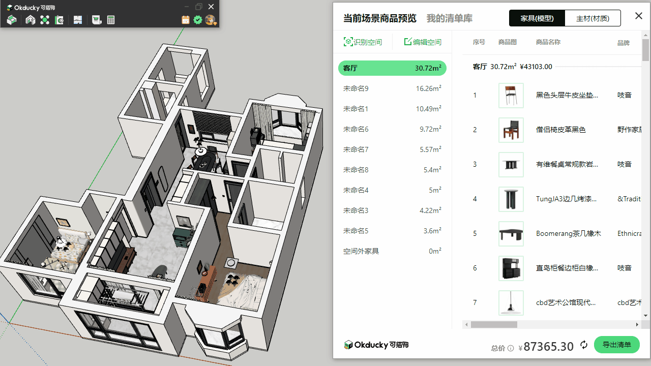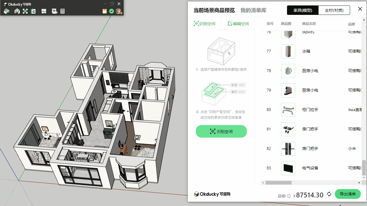 一键读取当前场景用到的所有家具(模型)&主材(材质),并统计总价。
