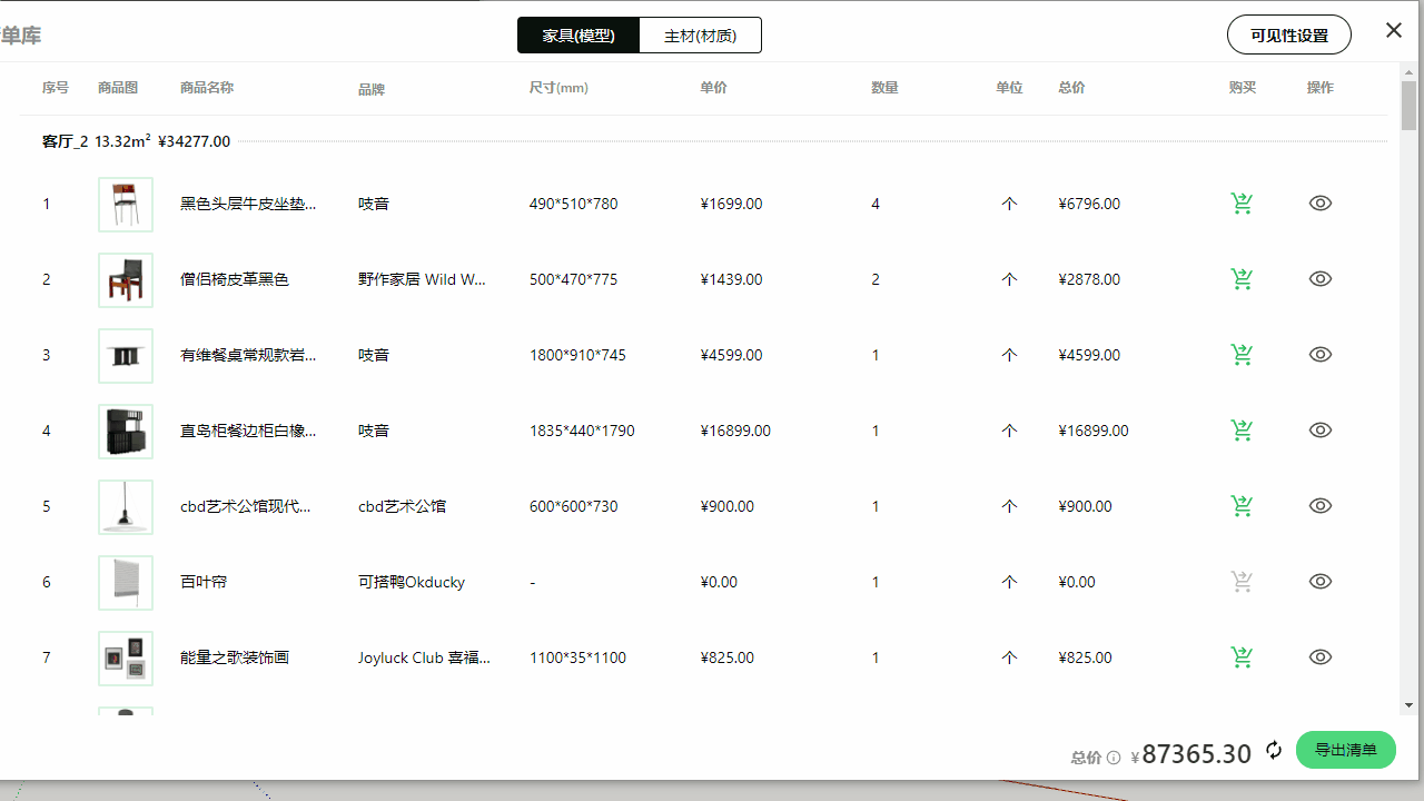 - 可见性:关闭后,该家具不会统计进行清单总价内。