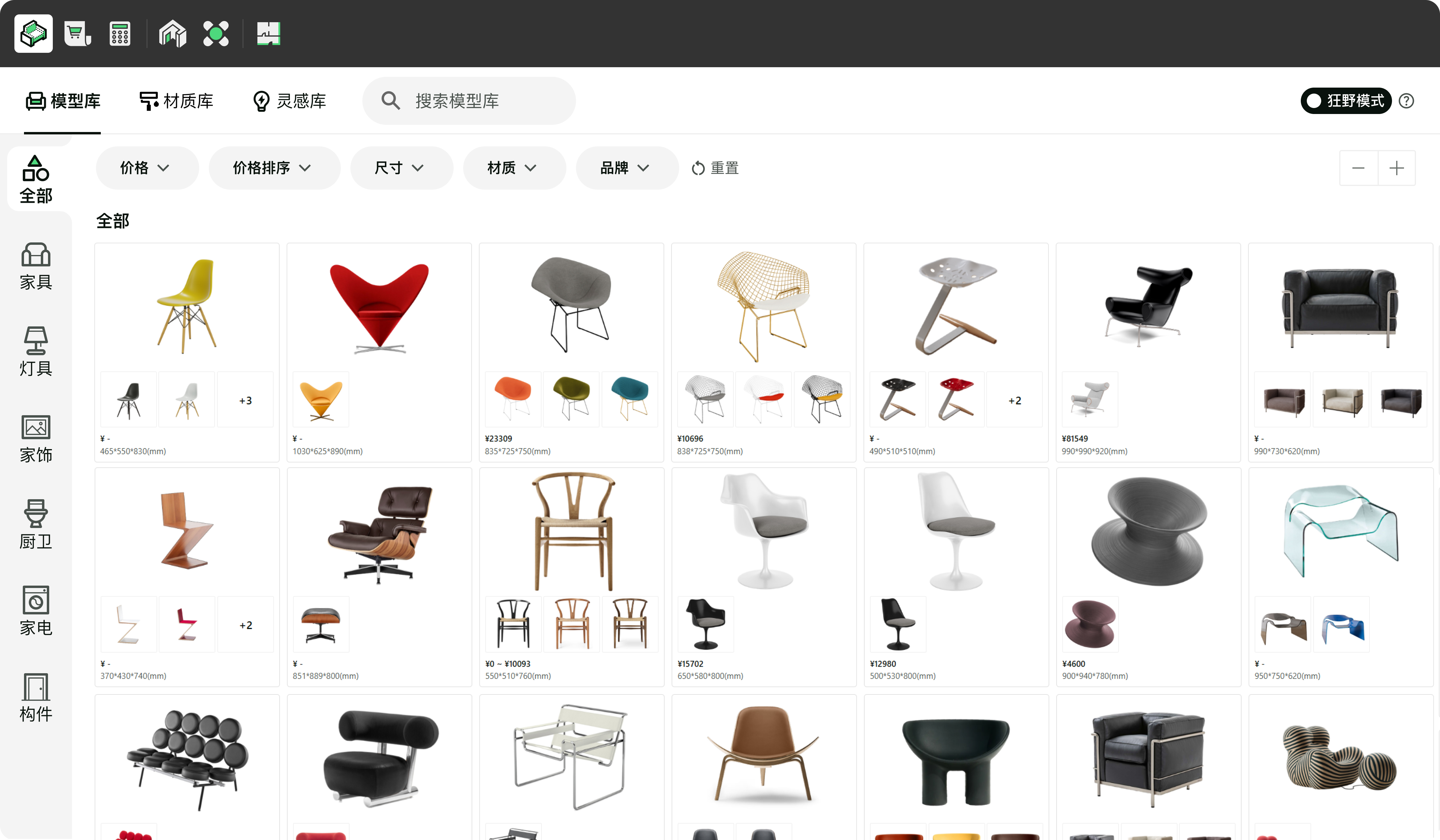 在素材库的右上角,有经典家具按钮,点击则将仅展示被鸭鸭列为世界经典家具的素材,点击其中的任意一款家具,都将可以看到它的设计者;设计时间;设计描述等。