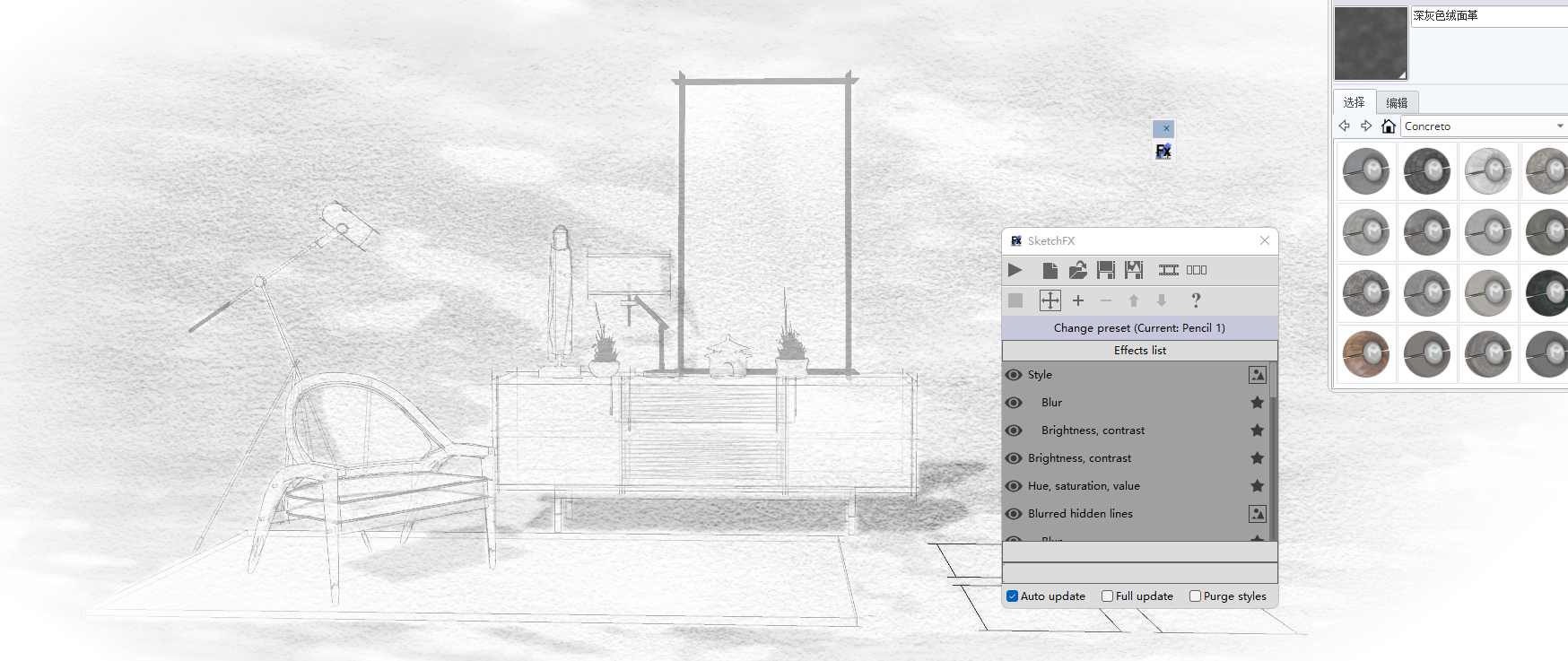 SketchFX可以为SketchUp添加艺术渲染功能,仅需一键点击就能为您的SU模型创建漂亮的预览,有各种定制预设(水彩、铅笔、景深、运动模糊等等)可供选择。