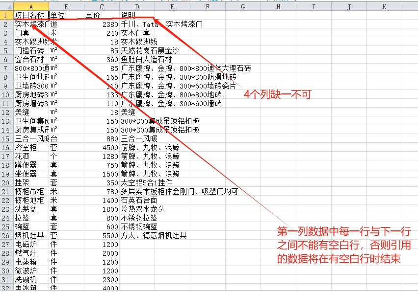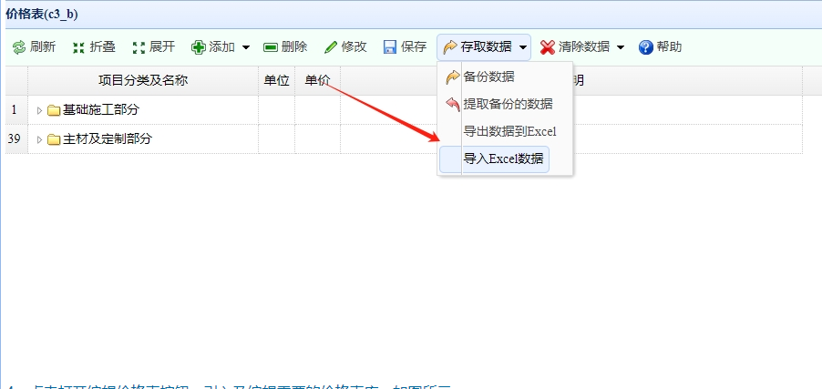 3、价格表还可以为用户导出和导入Excel表格,注意:导入Excel表格必须要采用导出的Excel表格格式!因此,建议用户可以在导出的Excel表格的基础上进行编辑再导入使用。如图所示为需要导入的Excel表格格式: