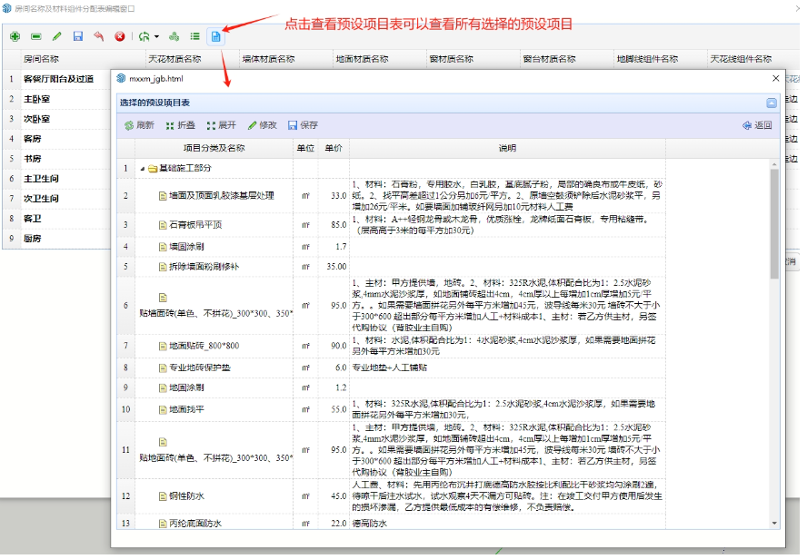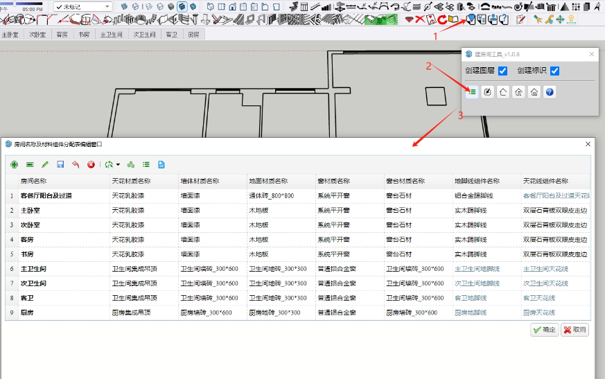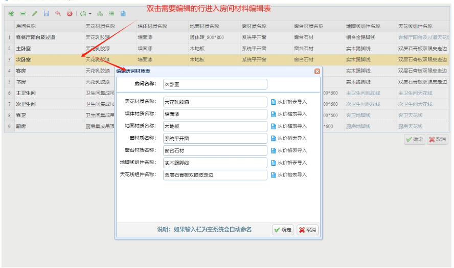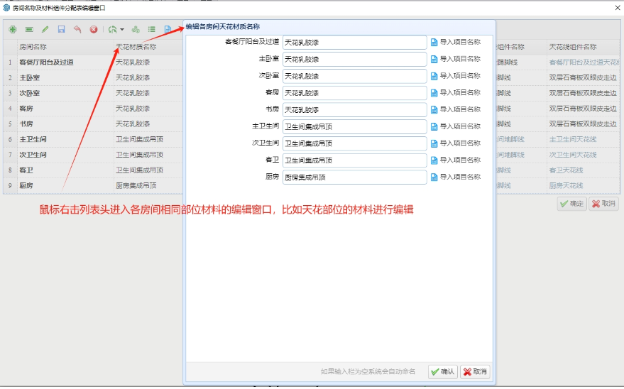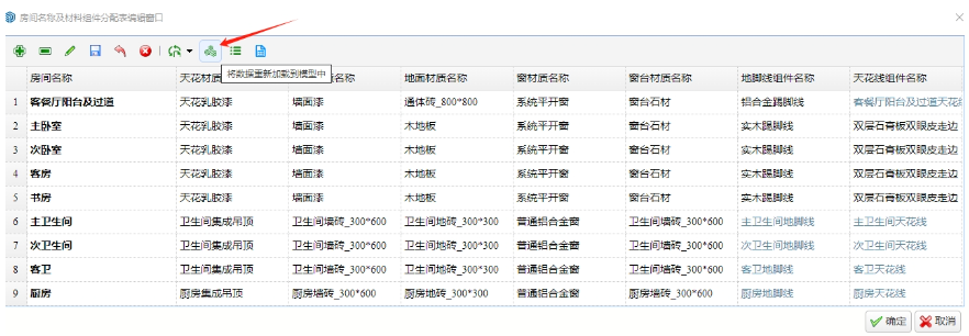 1、在建房间工具栏中点击房间名称及材料分配表按钮编辑需要的房间名称及各部位需要赋予的材料,系统已经自动命名了默认的名称,可以按需要进行修改。如图所示
