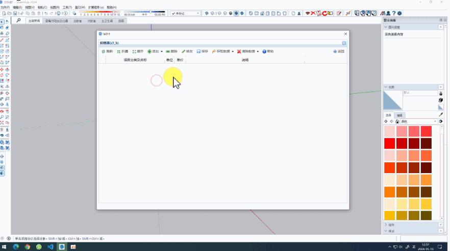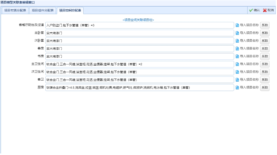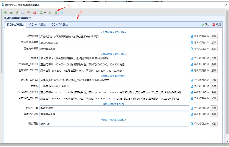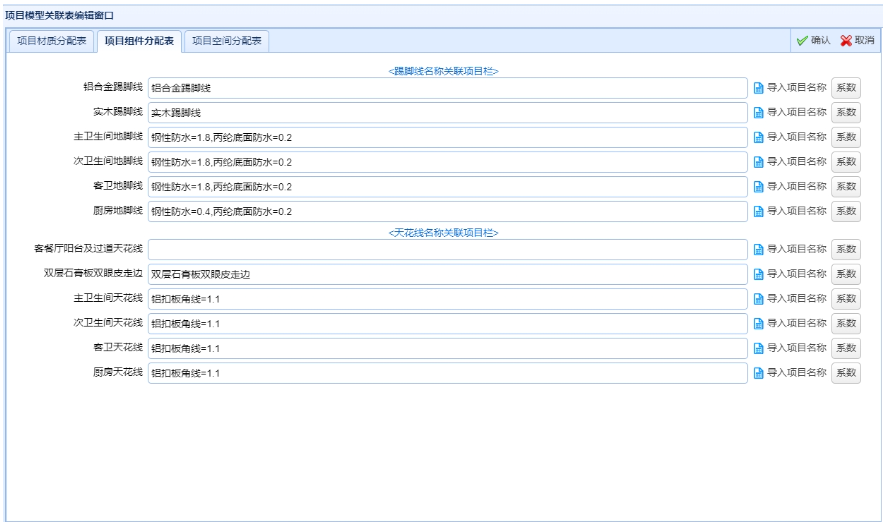 2、点击编辑预设项目关联表按钮,编辑项目关联表;在这个窗口中,可以将模型中的材质及组件对应的造价项目,通过导入价格表的项目名称来进行关联,同时通过输入系数来调整关联量的大小。