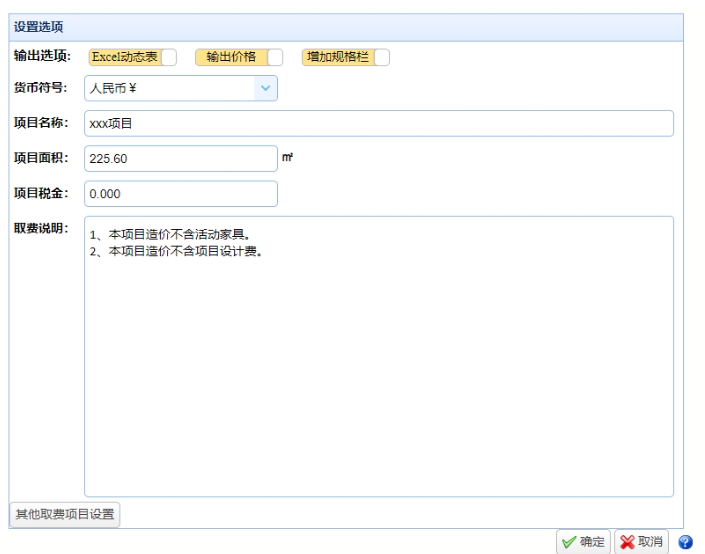 1、当项目数据录入完成后,返回主菜单,点击输出设置按钮,进入数据输出设置菜单选项。输出的Excel报表有两种方式,一种为静态表格,没有计算公式,只为打印或传输,而第二种动态表格则是输出一定的计算公式,所有数据的结果会因为其中数据的修改而改变。