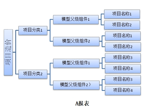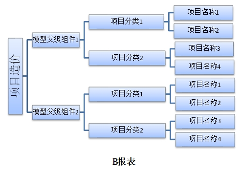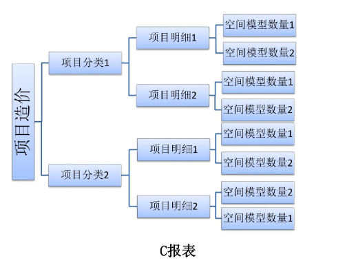 2、输出报表分为3种架构,A架构为以项目分类为第一目录,模型中的空间分类为第二目录进行分类统计计算,反之,如果是B类架构,则模型的父级组件名称为第一目录,项目分类为第二目录进行统计计算;C架构为以项目分类为第一目录,项目明细为第二目录进行空间分类统计计算。如图所示: