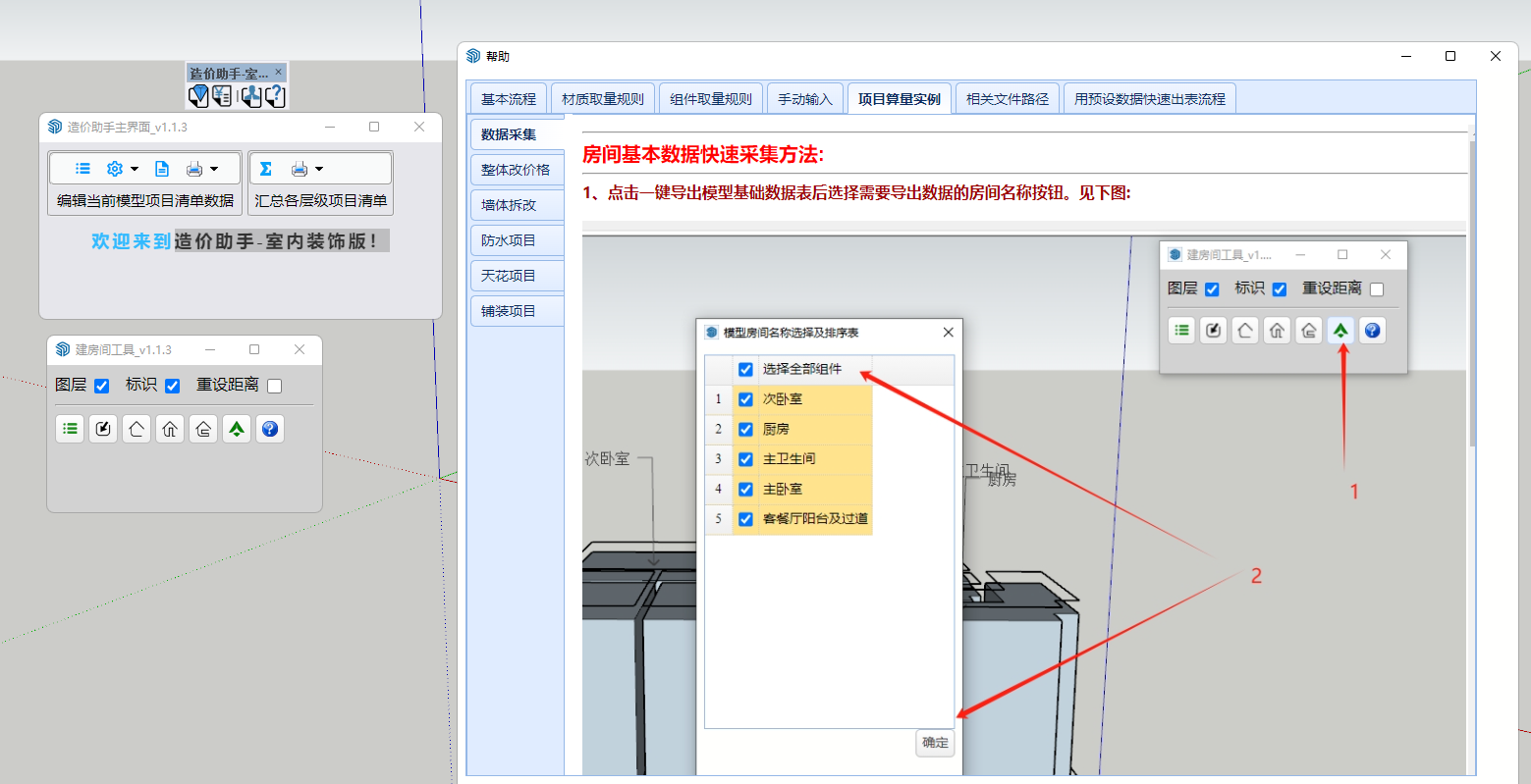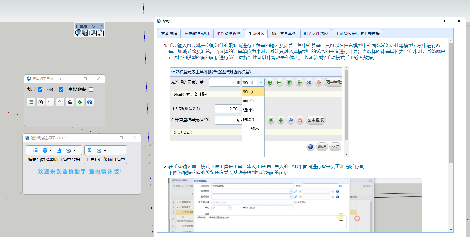 本插件可以从模型和组件中取量,可以手工输入项目及单价等,帮助文件内置在插件中,详细专业。