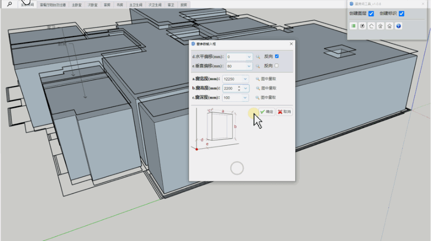 3、房间模型建立完成后,点击房间开窗工具,根据提示给房间开窗;如果遇见转角通窗,可以分别建立两个方向的窗后进行合并;注意用专用工具建立的房间和窗的每个面是有专门信息的,不要轻易删除和替换,否则重新加载数据到模型工具会对这个面失效。如图所示