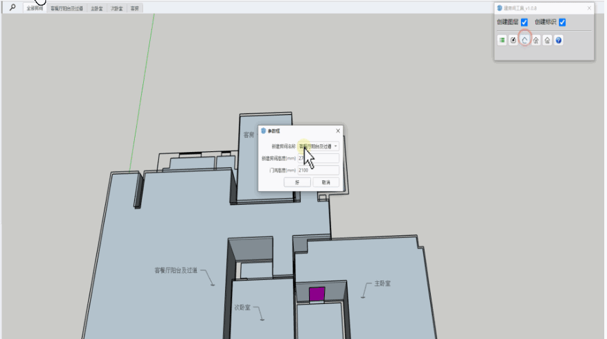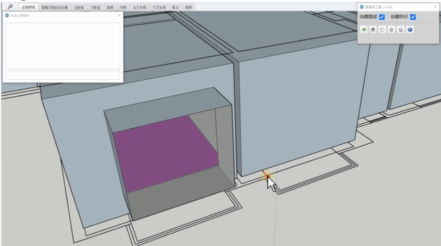 2、等全部平面模型完成后,再分别选择一每个房间平面,根据提示建立房间;系统会根据选择面相邻面的宽度自动建立门洞,根据房间轮廓建立地脚线和天花线,同时会根据前面编辑的分配表给房间赋予需要的材质。如图所示