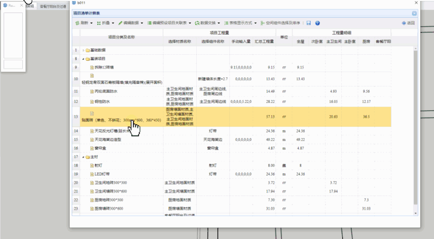 这个窗口由两个数据表组成,其中房间名称及材质分配表,是为下一步建模提供可选择的房间名称及各部位需要赋予的材质名称和创建的组件名称;而项目关联表则是为项目工程量计算提供模型中的关联数据。