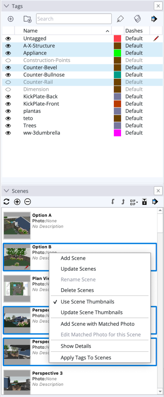 要使用这项新功能,首先为场景配置所需的标签或标签文件夹的可见性设置。接着,选择需要应用这些标签的场景。然后,在 Tags(标签)或 Scenes(场景)面板中右键单击,选择 Apply Tags to Scenes(将标签应用到场景)。所有选定标签及其当前可见性设置将自动应用到所选场景中。