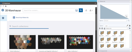 SketchUp 默认材质库中的所有材质现已升级为逼真材质。默认库提供了丰富的选项,如需更多选择,可转至 3D Warehouse 并搜索 Materials(材质)。