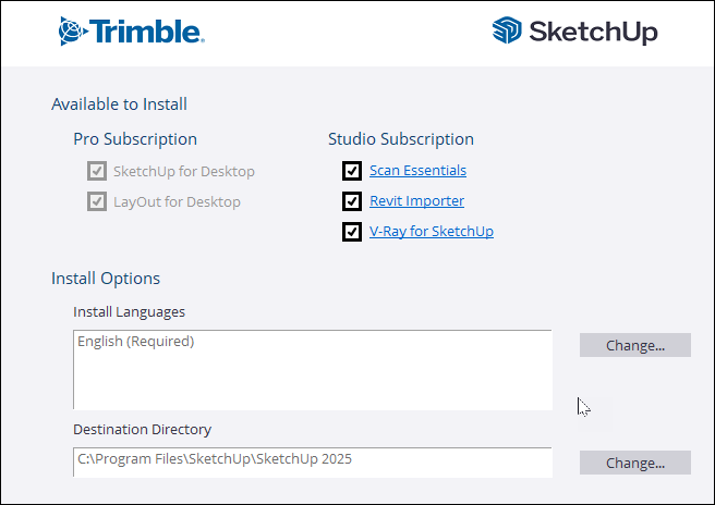对于全新安装 SketchUp 2025 的 Windows 用户,现在可以直接通过 Windows 安装程序下载适用于 SketchUp 的 V-Ray。默认情况下,安装程序会勾选所有三个 Studio 订阅功能(适用于 SketchUp 的 V-Ray、Revit 导入功能和 Scan Essentials)进行下载。您可以在安装过程中根据需要取消勾选,跳过某些功能的下载。