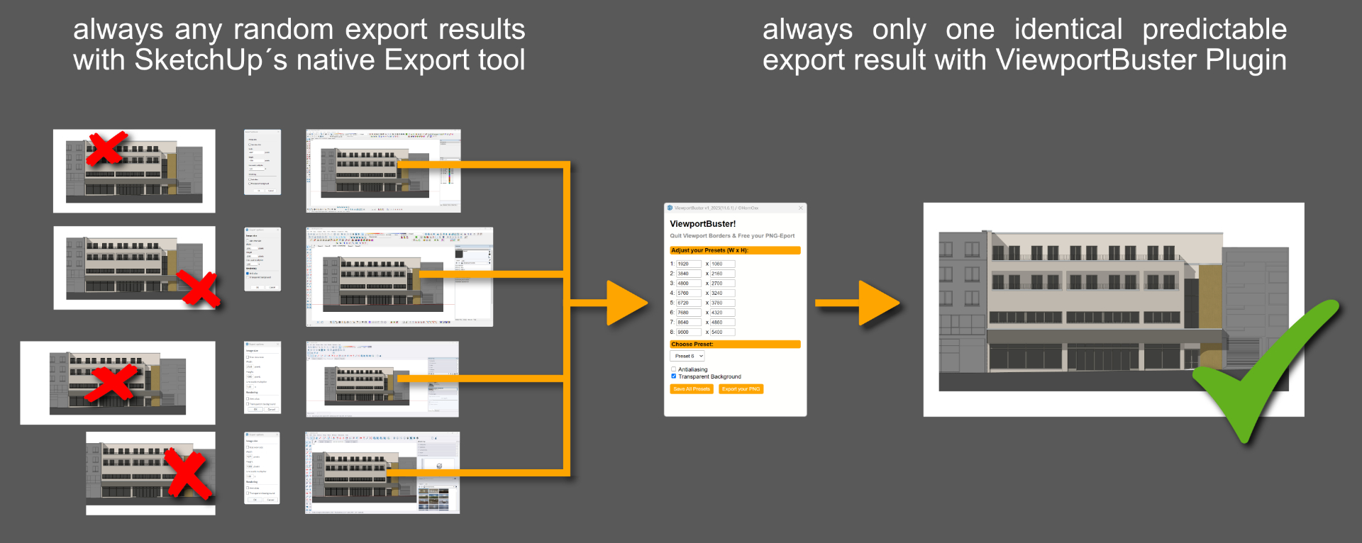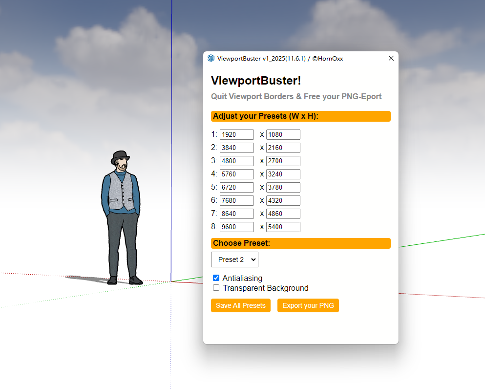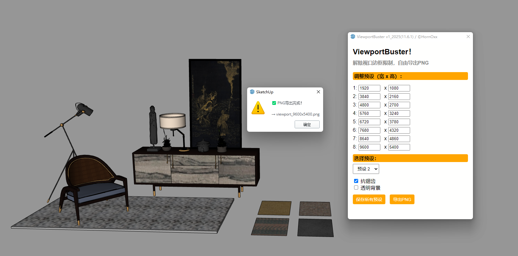 它是什么?ViewportBuster 是一款专为 SketchUp(Windows 版)定制的小型插件,它解决了一个重大的视口窗口大小的限制:它让您能够精确控制基于场景的 PNG 导出,像素级精准,甚至超越 SketchUp 的视口限制。