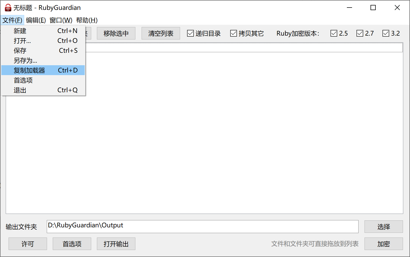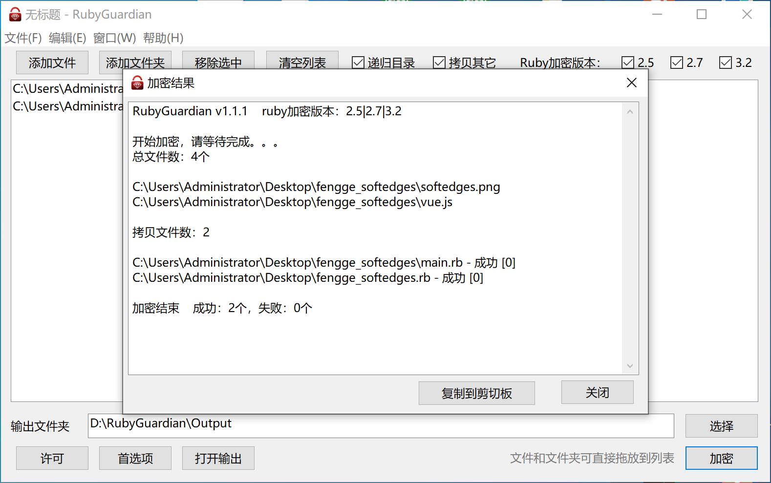 选择要加密的 Ruby 版本,以及勾选是否递归加密、复制其它文件到输出目录