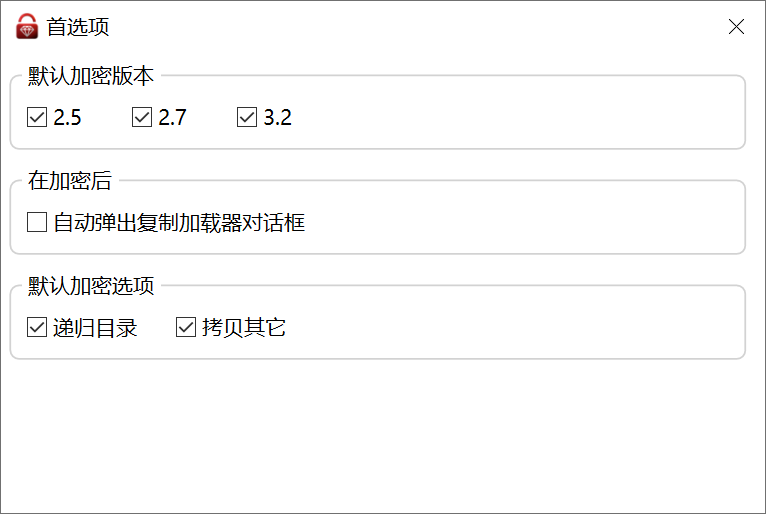 点击菜单 文件 -> 复制加载器,在弹出的对话框中选择目标文件夹,默认复制到输出目录,也可修改复制路径,点击复制加载器按钮即可。也可以在首选项中勾选 自动弹出复制加载器对话框,将在每次加密后弹出复制加载器对话框。