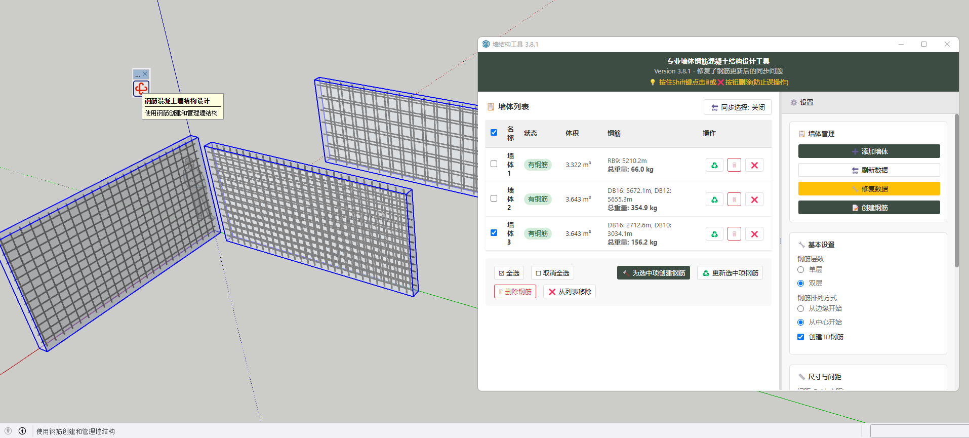 本工具能够快速高效精准将SketchUp成组的墙体进行钢筋排布设计,数据与模型可随时进行同步刷新修改,布置完墙体钢筋结构后会自动计算体积以钢筋型号及重量并在可视化列表中显示出来。