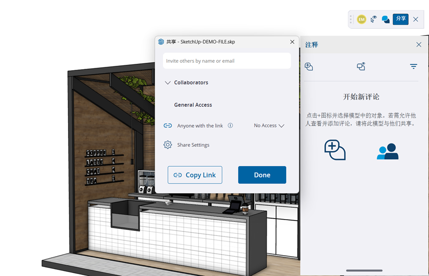 过去需要在电子邮件、截图手写批注和第三方工具之间频繁切换。现在,新的实时协同查看功能可以通过“共享”按钮直接控制谁能查看或评论您的模型。只需输入对方的邮箱地址,即可直接从 SketchUp 发送邀请。