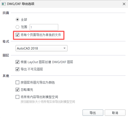 • 可将每个页面导出为单独的 DWG:LayOut 导出 DWG 现在允许将单个页面导出为单独的 DWG 文件。