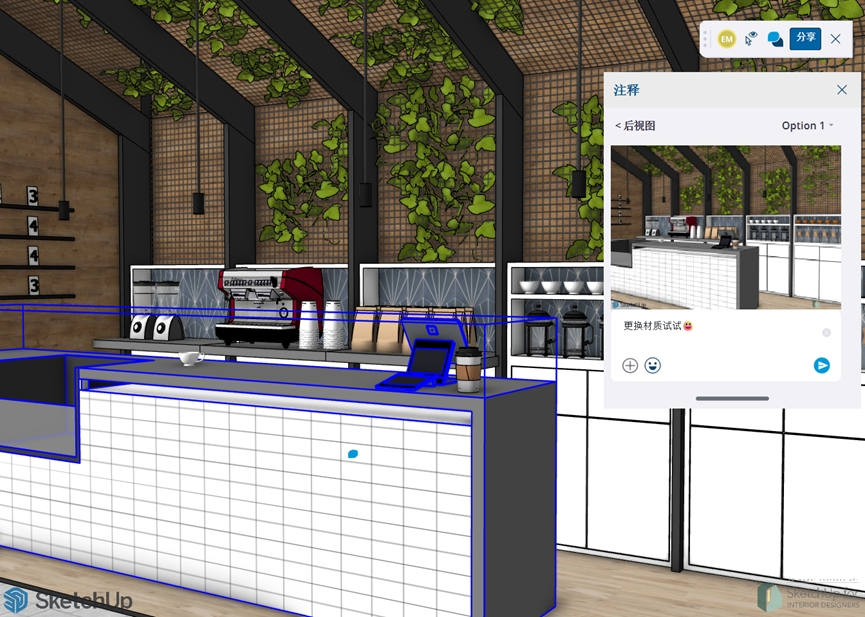 通过评论功能,协作者可以直接在模型中进行评论反馈。评论不仅是静态的注释,它们会附着在3D模型上,确保每条反馈精准对应模型中的相关部分。您可围绕设计细节展开讨论,@相关协作者,上传图片和相机视图来更清晰地阐述观点,还能添加喜欢的表情符号。借助这些有针对性的集中评论,您能在SketchUp中轻松开展设计讨论并高效决策。