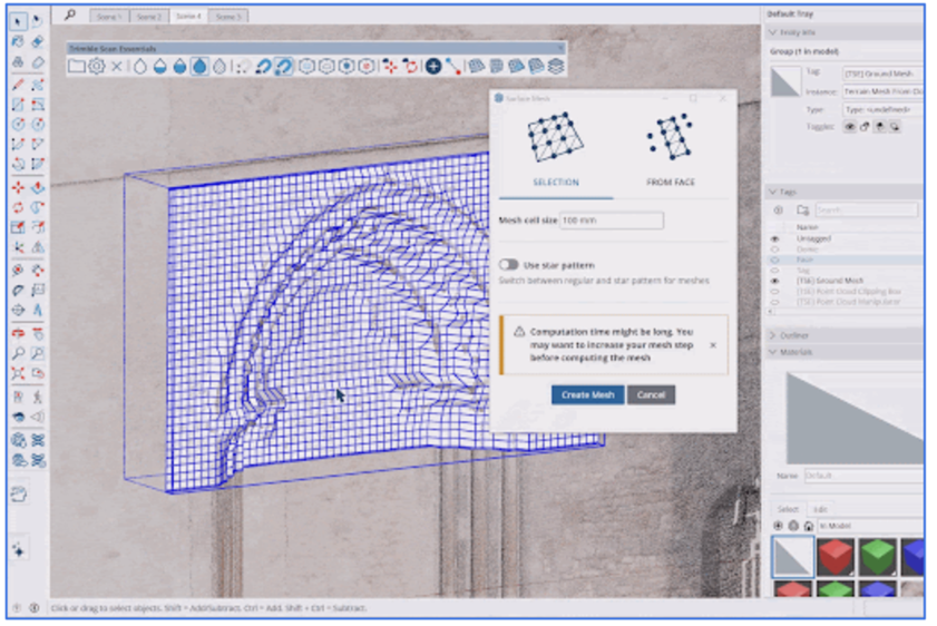 新增表面网格工具,使用预先绘制的任意形状的面作为边界来定义网格生成区域,更轻松地从点云中提取出SketchUp 几何体,加速模型搭建过程。