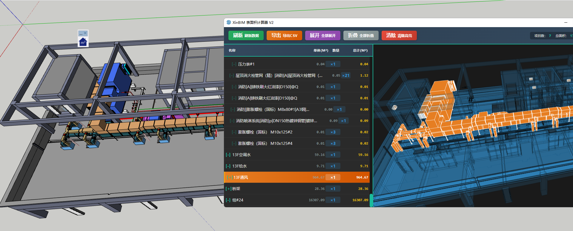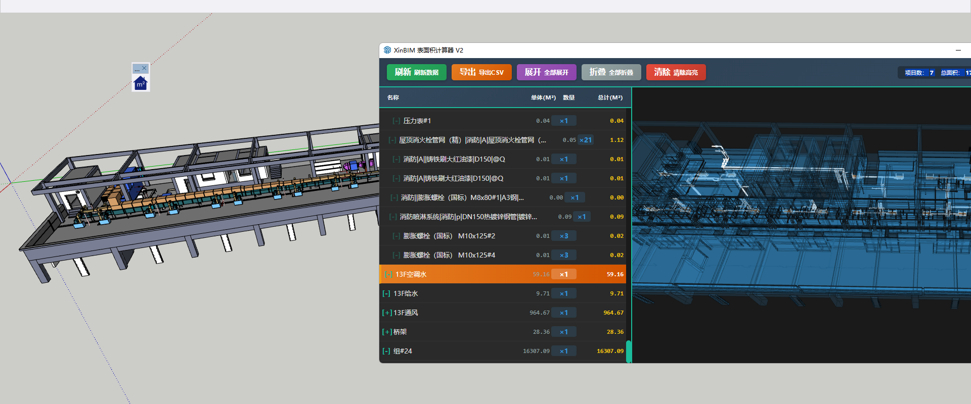 本插件可以将您的模型以很酷的驾驶舱的形式演示出来,左边的可以显示展开或者折叠各组件的名称,右边的图形显示中可以对应显示高亮该组件,同时可以到处csv进行Excle二次处理,目前功能仅限于数量和表面积的统计。