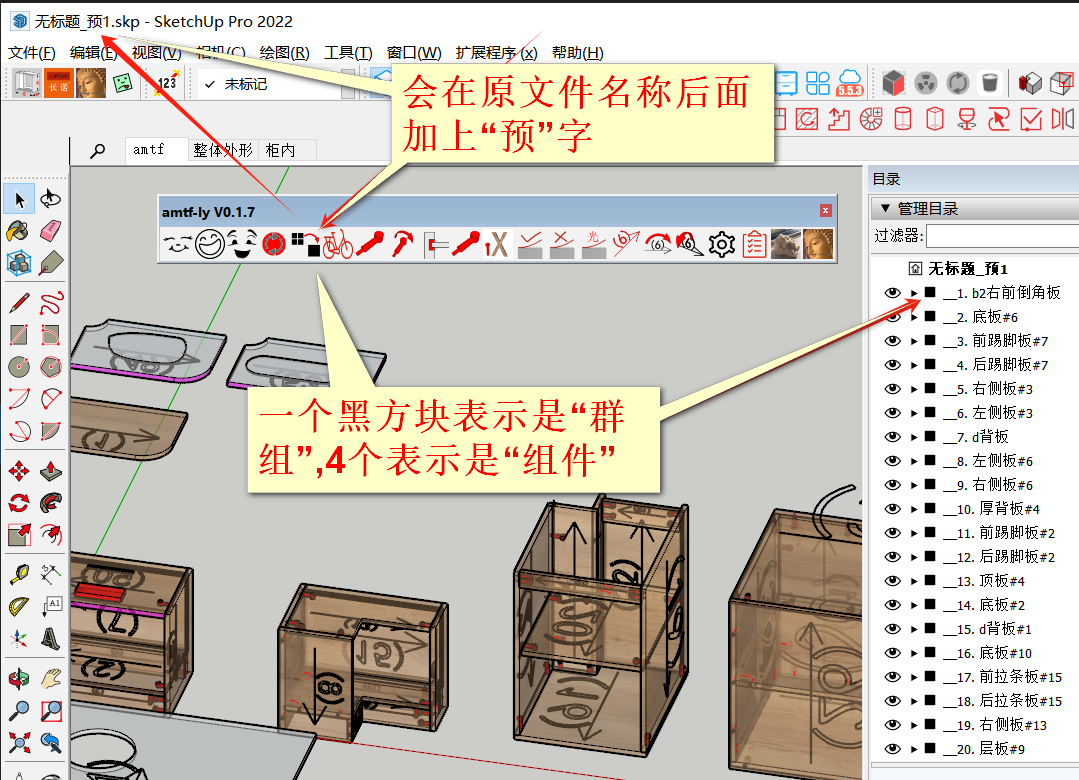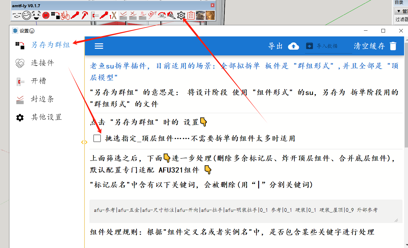 另存为群组按钮作用说明:将当前su文件(设计阶段用),另存一份(拆单阶段用),然后找到含