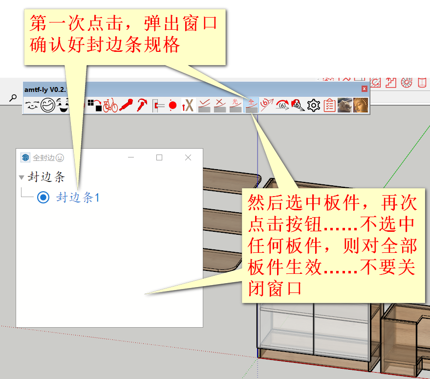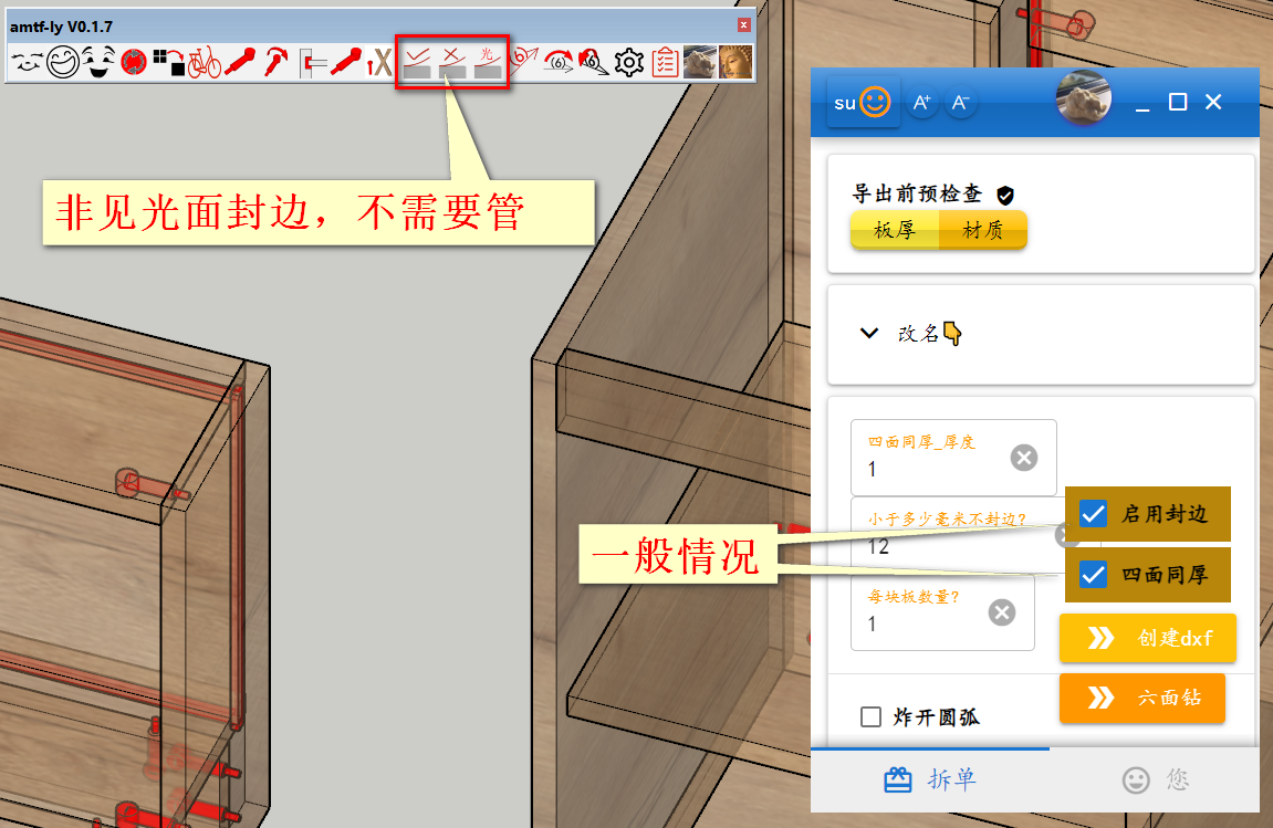 除非是想精确控制见光面封边,否则不需要管工具栏中的三个图标,只需要在exe界面选中相应选项