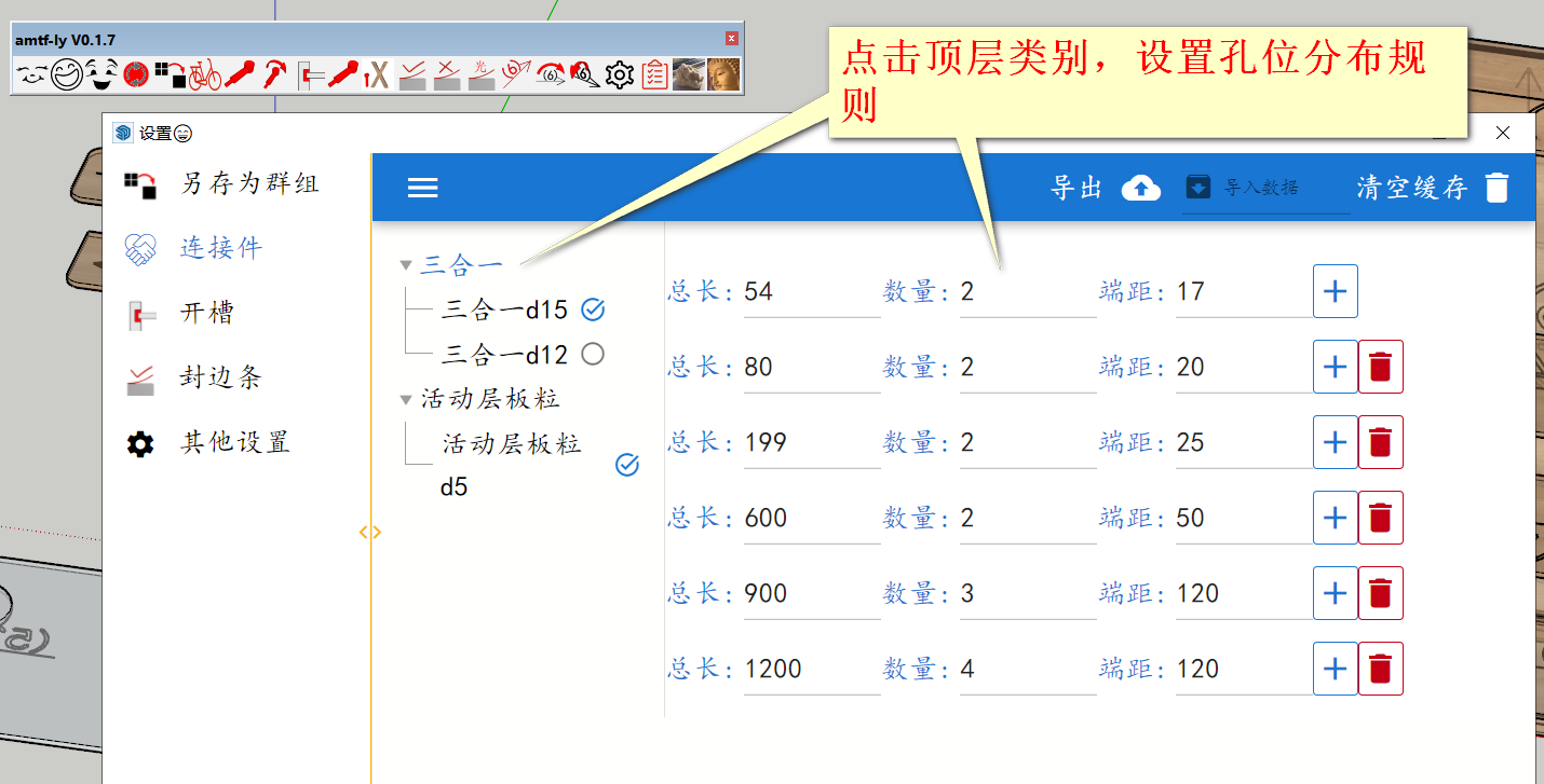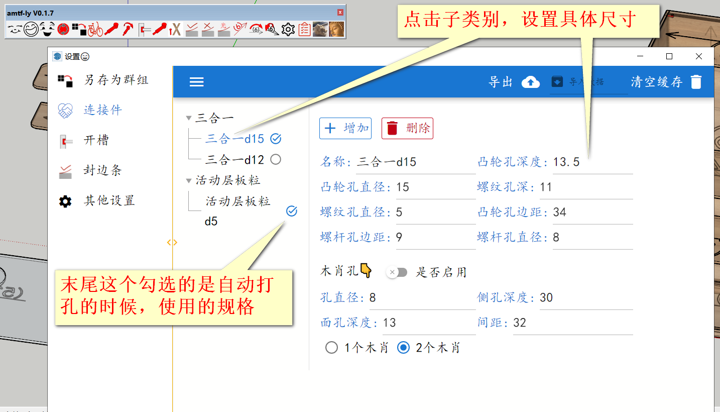 设置按钮,在弹出页面中,点击连接件、开槽,设置好三合一等尺寸规格 -